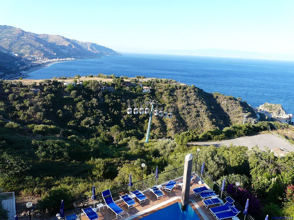 Tagesthema: Ausblick – Blick vom Hotel auf die Seilbahn in Taormina