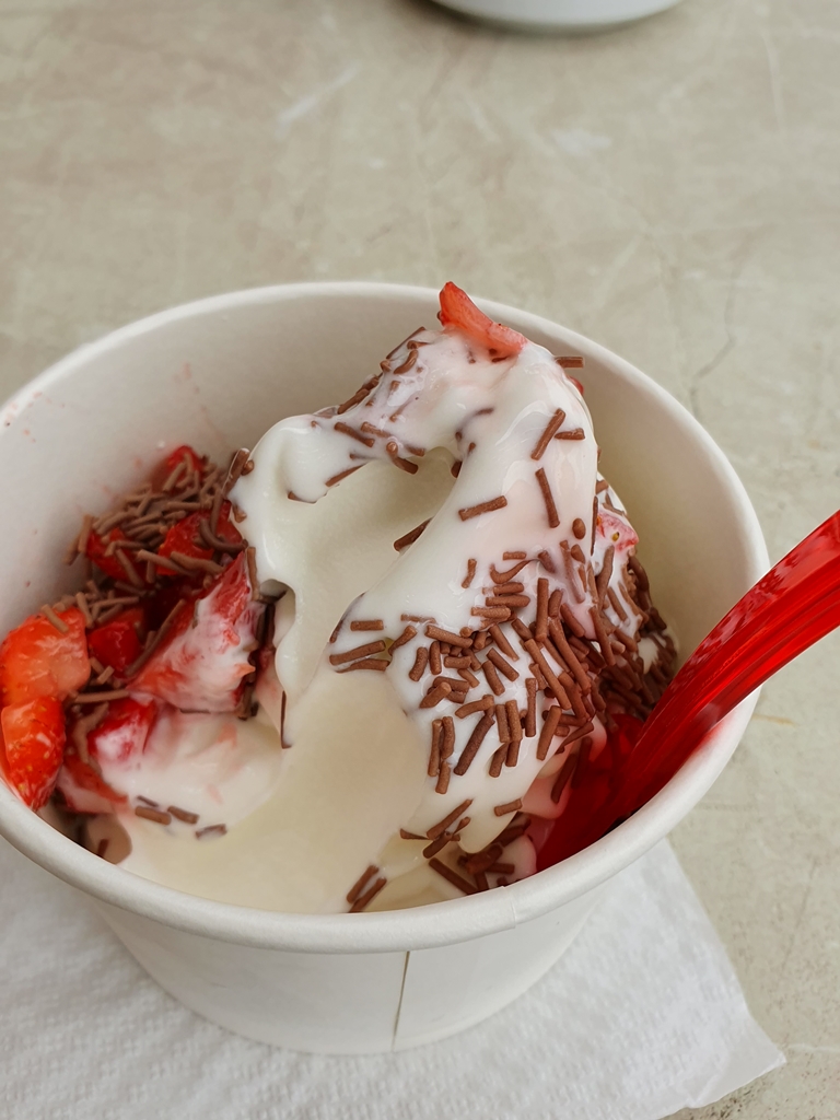 Joghurt-Eis aus griechischem Joghurt mit Schokostreuseln und Erdbeeren