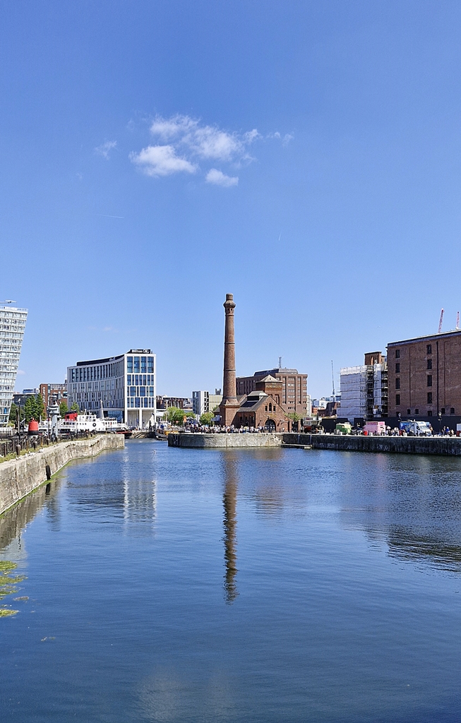 Der Blick rüber zum „Pump House“, das ist der große Schornstein (unten ist ein Pub drin)
