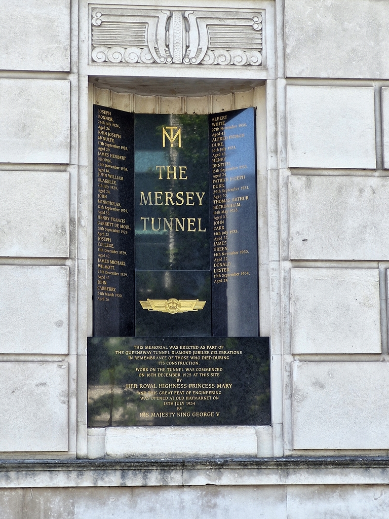 Tafel am Lüftungsschacht des Mersey-Tunnels (die Rückseite sieht aus wie die Zentrale von „Men in Black“, hier Teil 1, wo Will Smith das erste mal auf das Gebäude zuläuft)
