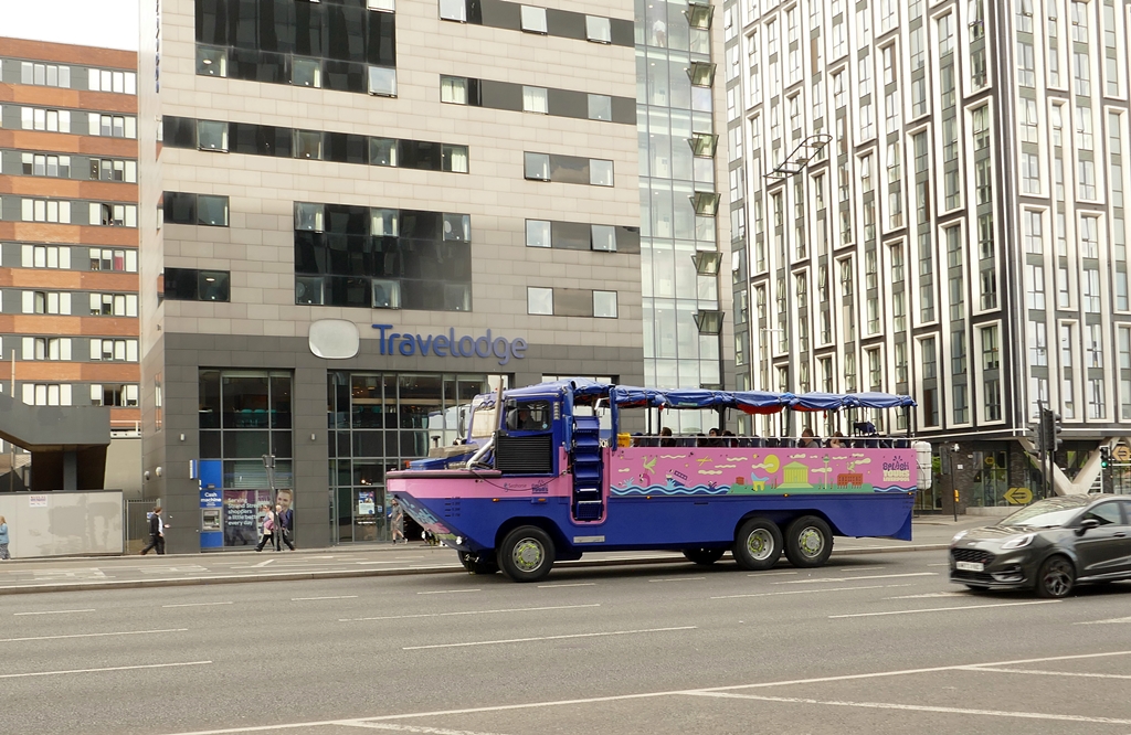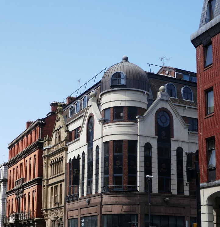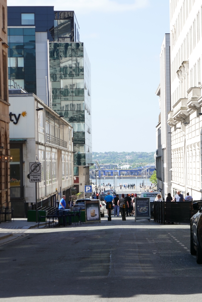 Blick von der Kreuzung Water Street / Dale Street (Water Street sieht man jetzt) Richtung Mersey. Eine Woche später passierte genau an dieser Stelle, wo die Schilder stehen, der Anschlag.