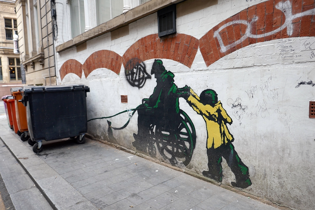 Banksy-Art, aber kein Original. Leider konnte man das nicht ganz fotografieren, da die Mülltonnen davor standen. Wer möchte, kann sich das Bild hier: https://www.bristolpost.co.uk/news/uk-world-news/new-banksy-style-artwork-appears-9180793 komplett anzeigen (ist eine englische Tageszeitung)