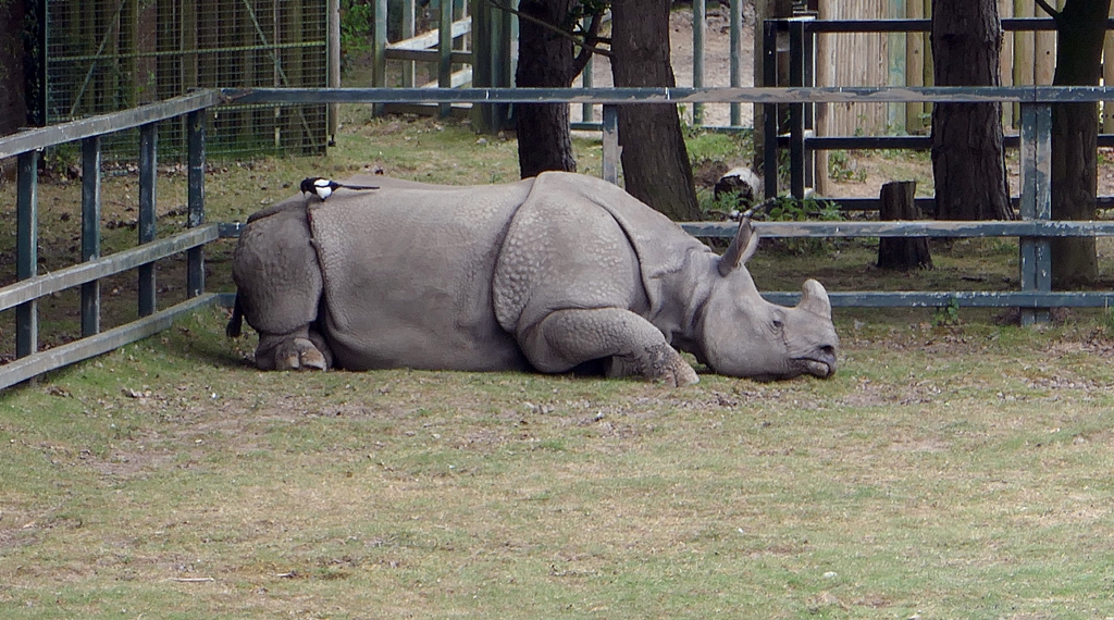 Greater One-Horned Rhino – zu deutsch: Panzernashorn. Hier mit Elster 😉 (das ist eins der Bilder, wie man Fotos im Zoo nicht machen sollte – das Gatter ist mit drauf)