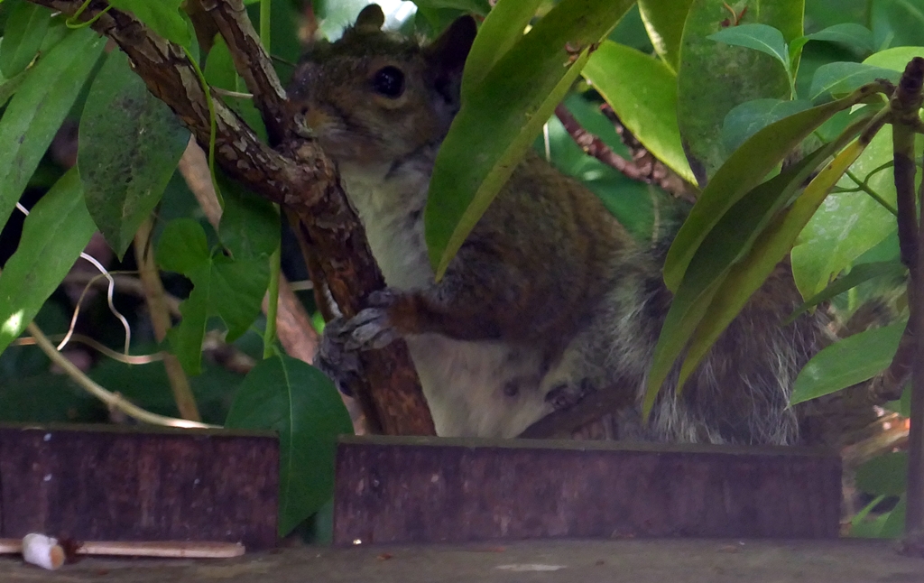 Einheimisches Eichhörnchen bei der Plünderung einer Mülltonne (so riesige Eichhörnchen hab ich noch nie gesehen und davon liefen einige durch den Park)