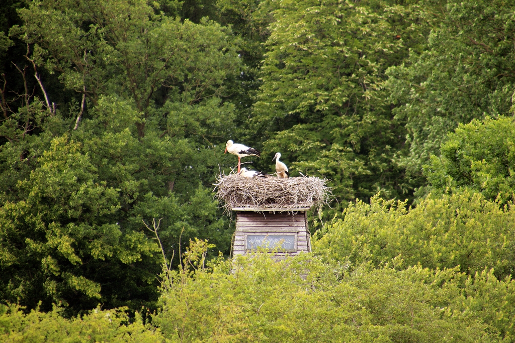 Vor einiger Zeit konnte ich in der Nähe der Wildtierstation Sachsenhagen Störche beobachten, die einen Hochstand (nennt man das so?) okkupiert haben.