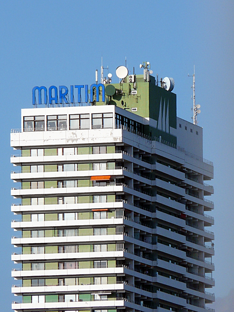 Vor 15 Jahren gab es noch ein Cafe in der 34. Etage des Maritim-Hochhauses. November 2024 war mein Ausblick ähnlich (da wo die ausgefahrene orange Markise ist, das ist die 31. Etage – da weiter nach rechts, die vorletzte Wohnung)