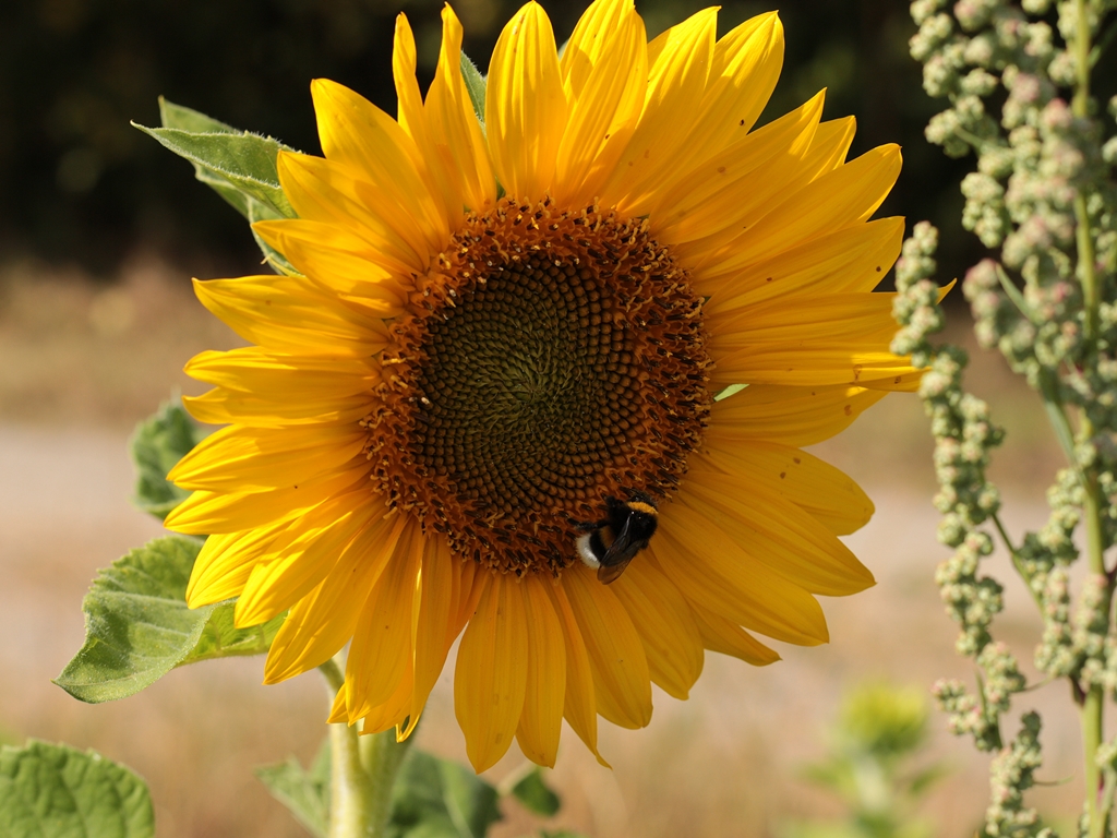 Sonnenblume mit Untermieter – der erste Versuch mit einer Festbrennweite von 50mm fotografiert