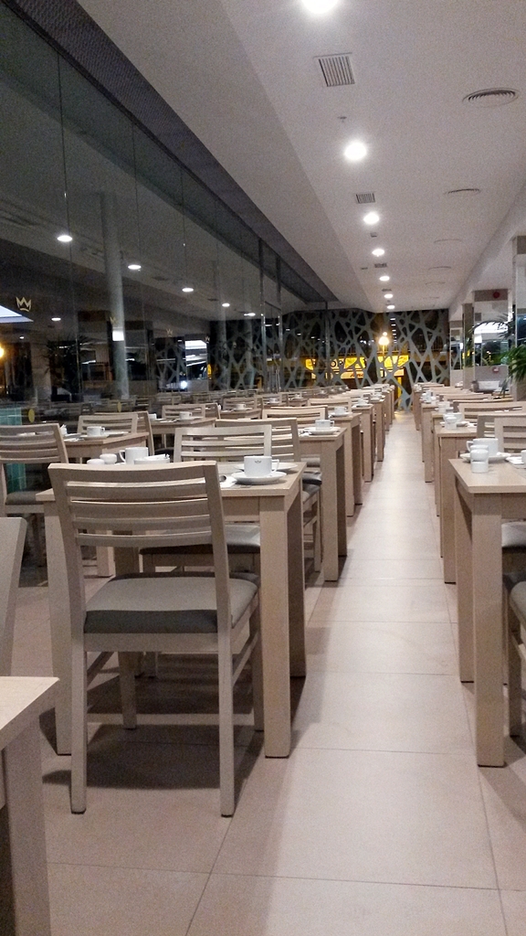 Rückreise – morgens um kurz vor 5 Uhr einen Kaffee trinken im leeren Frühstücksraum (im Hintergrund sieht man die Leuchtreklame der deutschen Bäckerei)