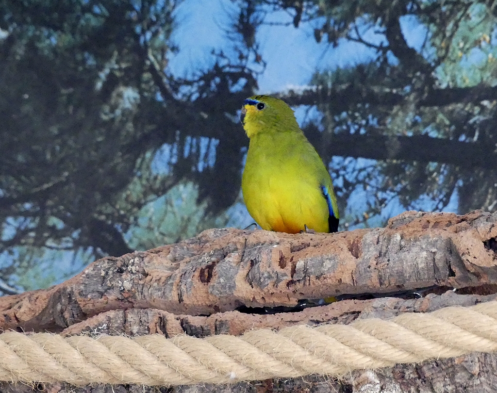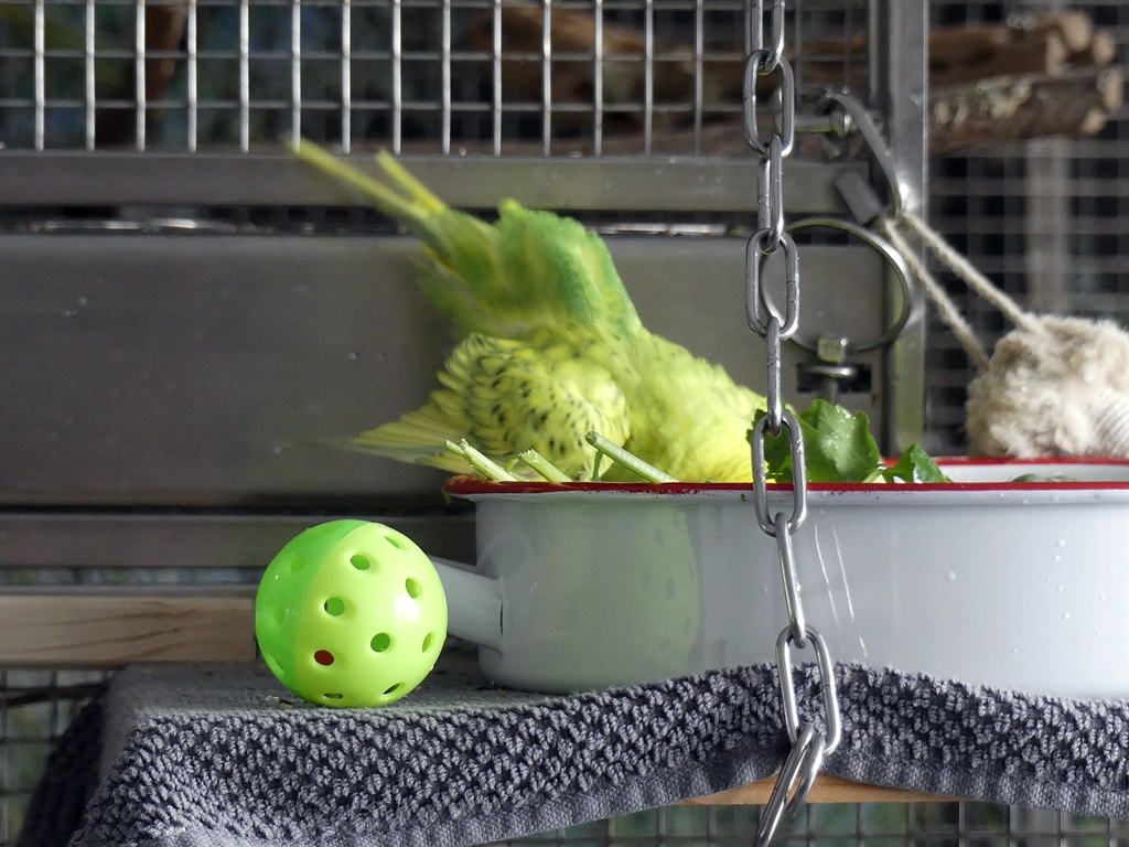 Der Wächter 😉 Schmucksittich-Hahn Buck beobachtet das ganze aus sicherer Entfernung.