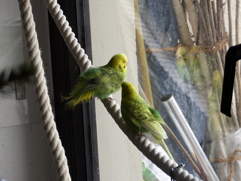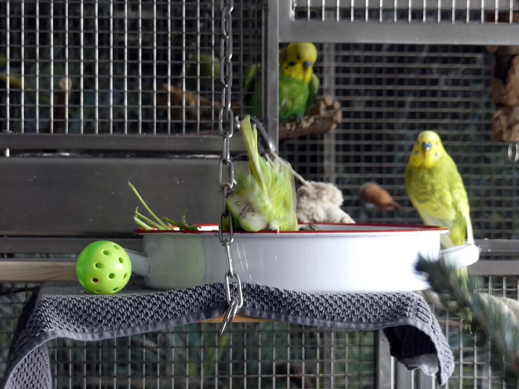 Der Wächter 😉 Schmucksittich-Hahn Buck beobachtet das ganze aus sicherer Entfernung.