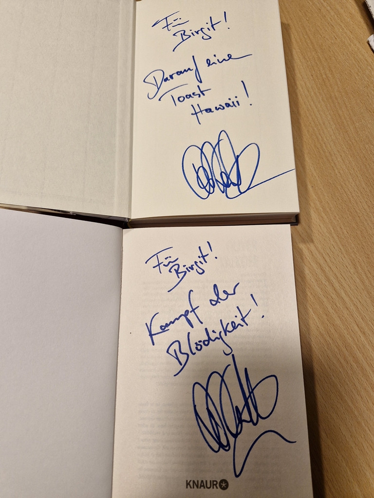 Nach der Show haben wir uns in die Schlange gestellt, um die Bücher signieren zu lassen. Ich musste unbedingt meine Frage zu den Hemden loswerden und warnte meinen Partner schon mal vor. Der kennt das schon von anderen Promis, wo ich den Mund nicht halten kann.